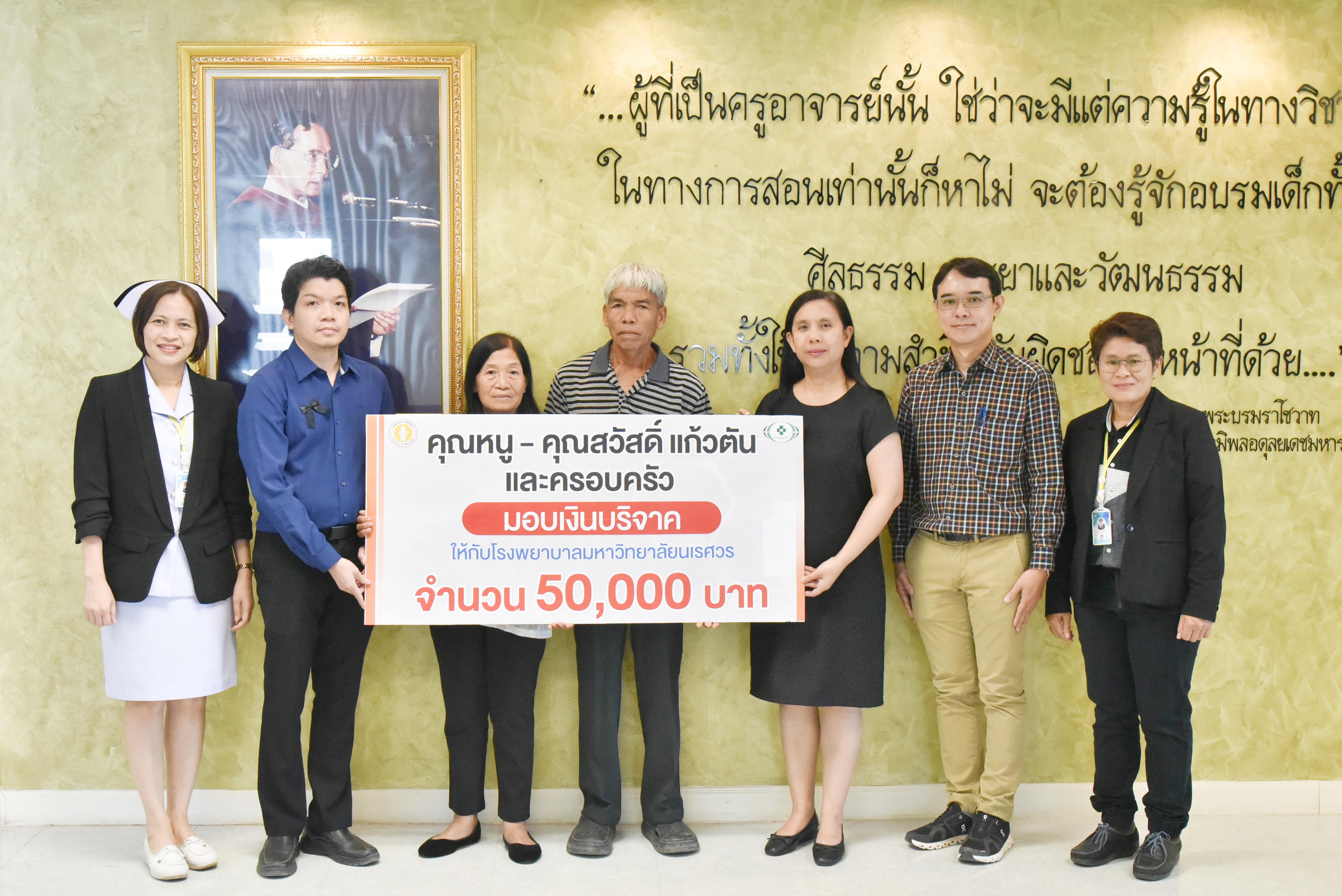 คุณหนู–คุณสวัสดิ์ แก้วตัน และครอบครัว มอบเงินบริจาคแก่โรงพยาบาลมหาวิทยาลัยนเรศวร จำนวน 50,000 บาท