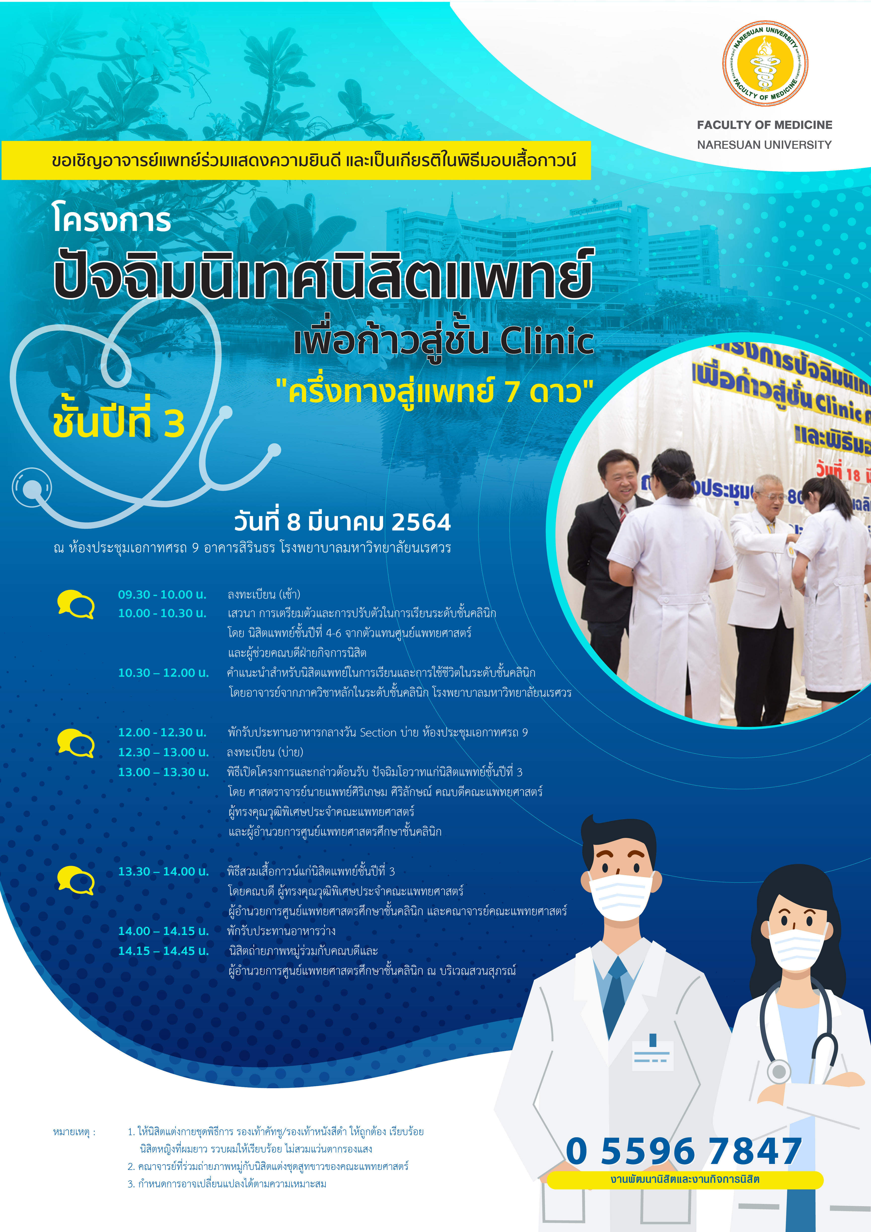 ขอเชิญอาจารย์แพทย์ร่วมแสดงความยินดีและเป็นเกียรติในพิธีมอบเสื้อกาวน์ ในพิธีปัจฉิมนิเทศ นิสิตแพทย์ชั้นปีที่ 3 เพื่อก้าวสู่ชั้น Clinic “ครึ่งทางสู่แพทย์ 7 ดาว” ในวันจันทร์ที่ 8 มีนาคม 2564 ณ ห้องประชุมเอกาทศรถ 9 ชั้น 3 อาคารสิรินธร โรงพยาบาลมหาวิทยาลัยนเรศวร |