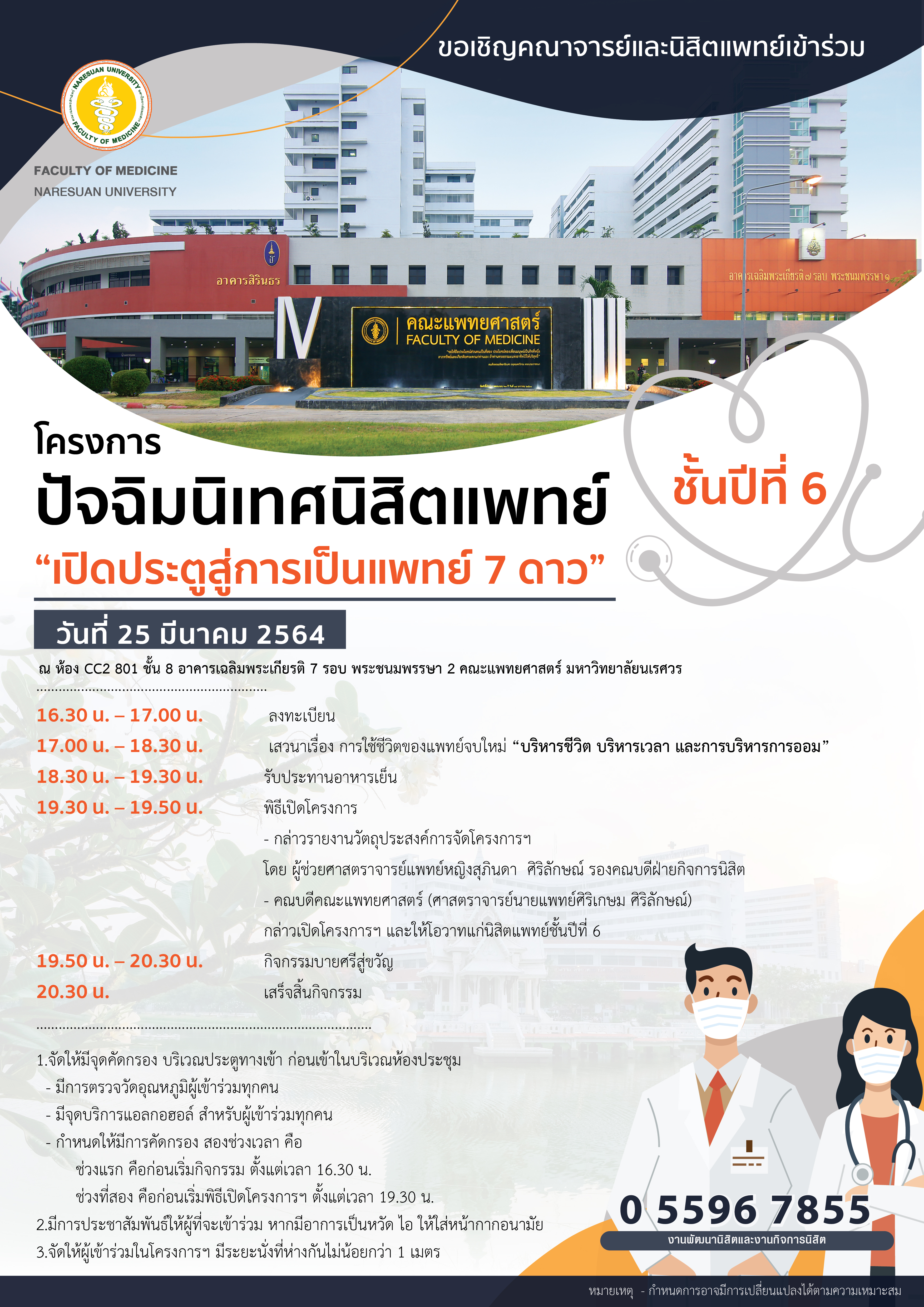 ขอเชิญคณาจารย์ เข้าร่วมแสดงความยินดีและเป็นเกียรติในพิธีปัจฉิมนิเทศนิสิตแพทย์ชั้นปีที่ 6 "เปิดประตูสู่การเป็นแพทย์ 7 ดาว" ในวันพฤหัสบดีที่ 25 มีนาคม 2564 เวลา 17.00 น. ณ ประชุม CC2-801 ชั้น 8 อาคารเฉลิมพระเกียรติ 7 รอบ พระชนมพรรษา 2 คณะแพทยศาสตร์ มหาวิทยาลัยนเรศวร |