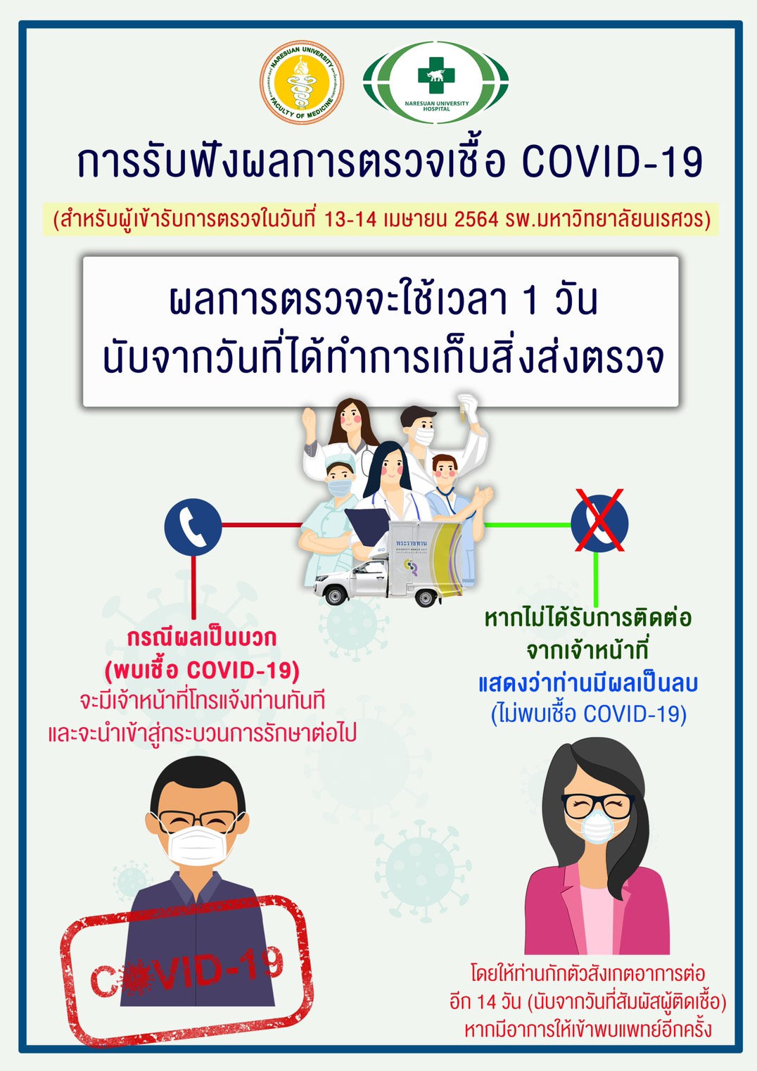 การรับฟังผลการตรวจเชื้อ COVID-19 สำหรับผู้เข้ารับการตรวจ วันที่ 13-14 เมษายน 2564 ณ โรงพยาบาลมหาวิทยาลัยนเรศวร