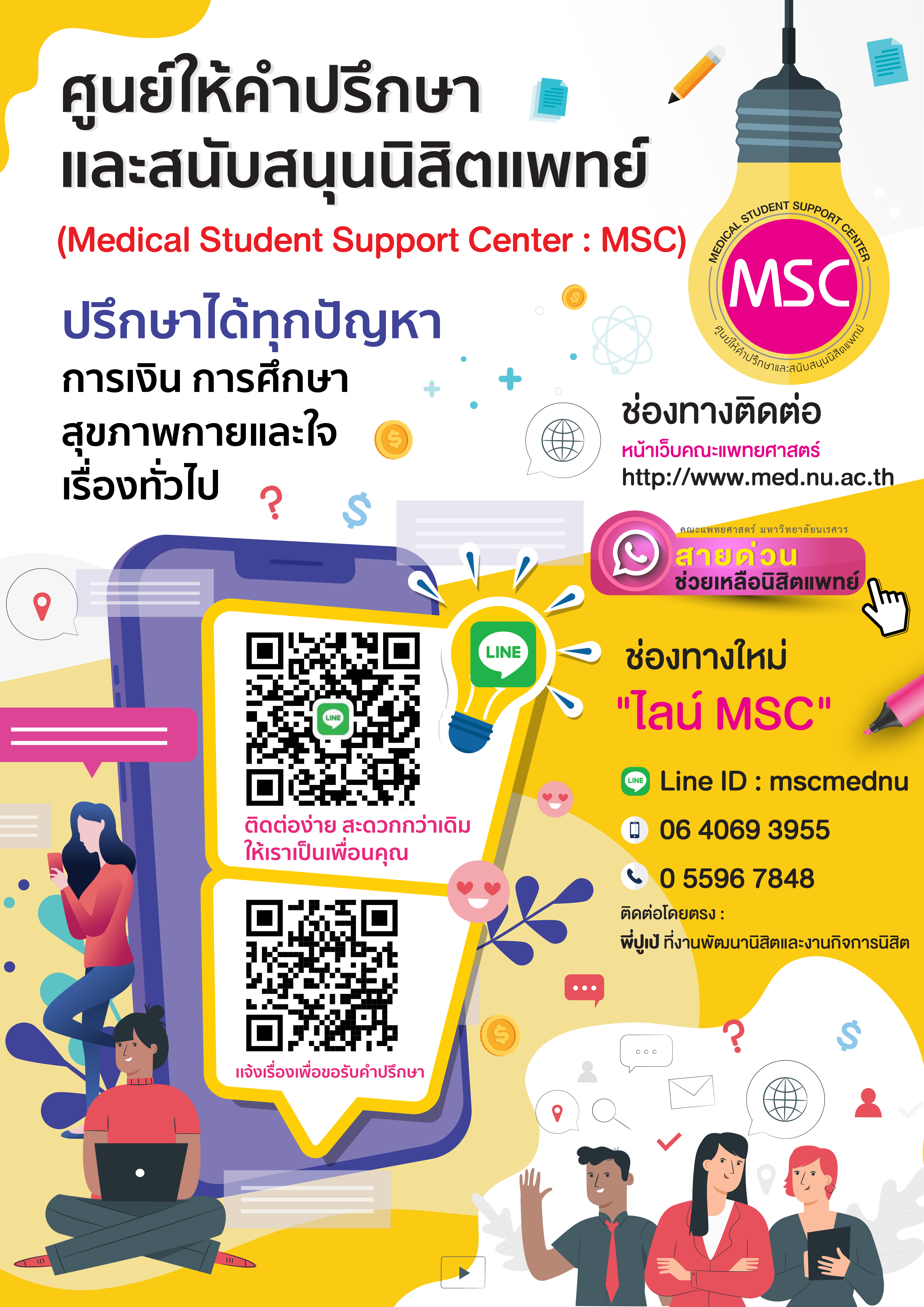 ศูนย์ให้คำปรึกษาและสนับสนุนนิสิตแพทย์ (Medical Student Support Center : MSC) ปรึกษาได้ทุกปัญหา การเงิน การศึกษา สุขภาพกายและใจ เรื่องทั่วไป
