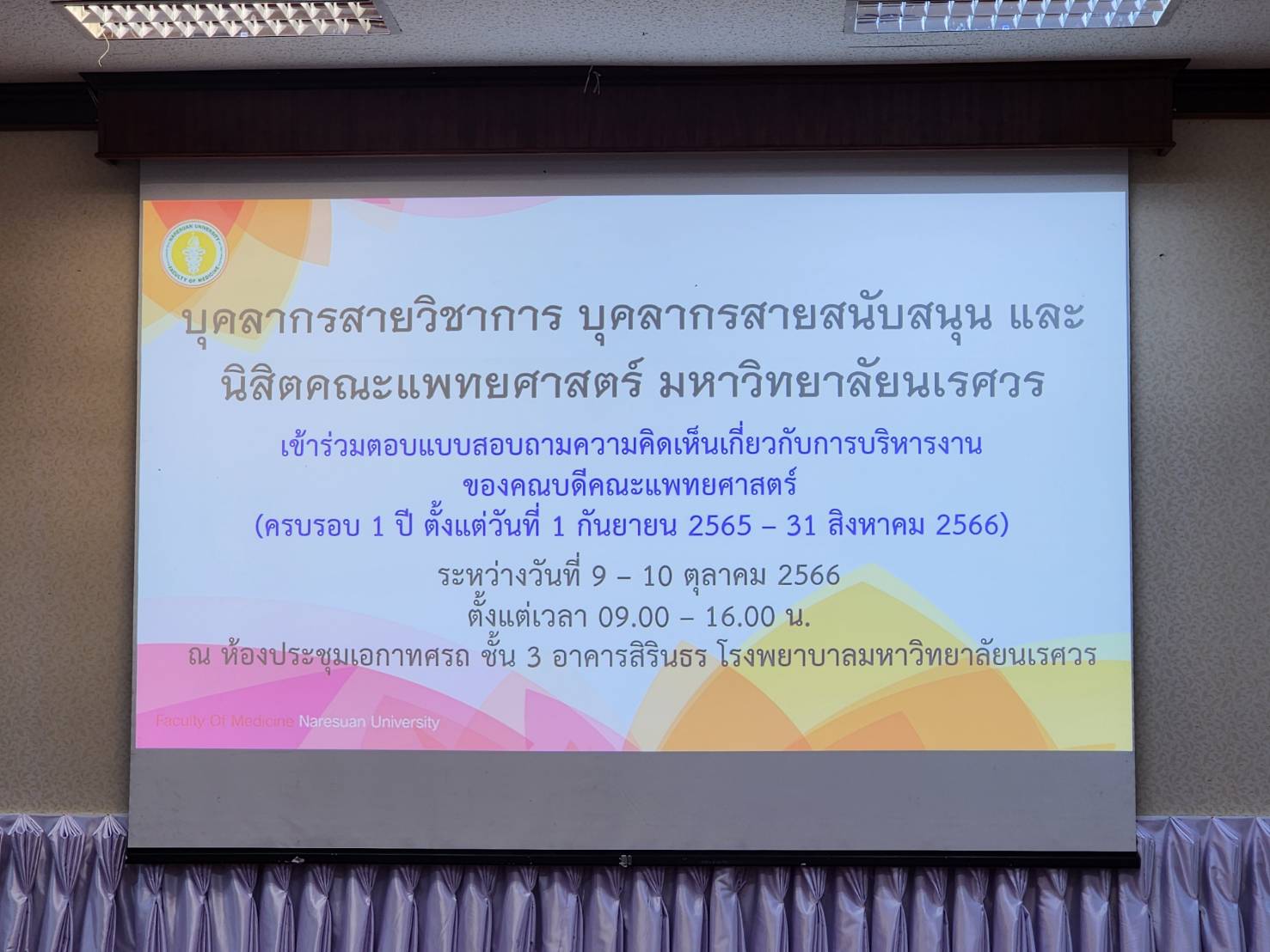 งานบริหารเทคโนโลยีสารสนเทศ ช่วยจัดเครื่องคอมพิวเตอร์โน้ตบุ๊ค เพื่อจัดกิจกรรมสอบถามความคิดเห็นเกี่ยวกับการบริหารงาน ของคณบดีคณะแพทยศาสตร์ (ครบรอบ 1 ปี ตั้งแต่วันที่ 1 กันยายน 2565 - 31 สิงหาคม 2566) ระหว่างวันที่ 9 - 10 ตุลาคม 2566 ตั้งแต่เวลา 09.00 - 16.00 น. ณ ห้องประชุมเอกาทศรถ ขั้น 3 อาคารสิรินธร โรงพยาบาลมหาวิทยาลัยนเรศวร |