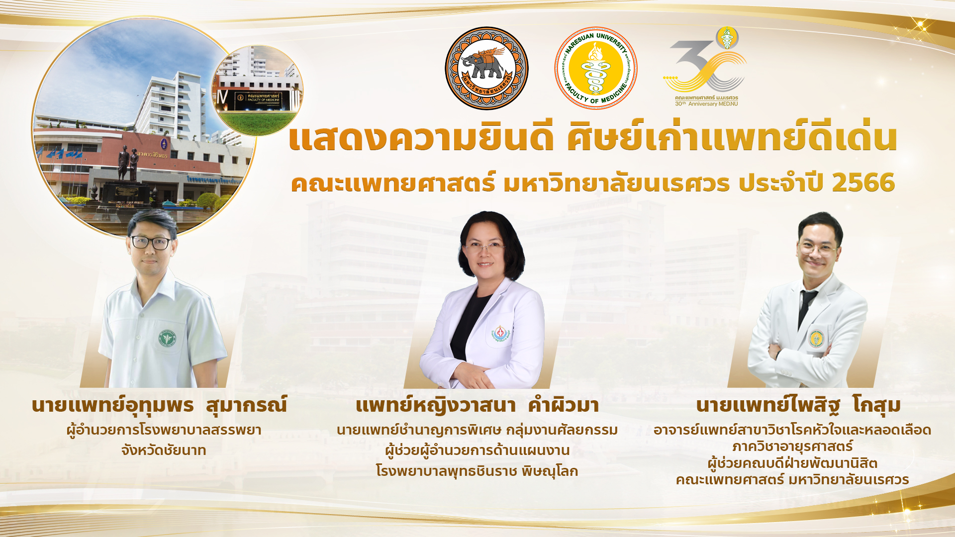 รายชื่อผู้เข้ารับรางวัลศิษย์เก่าแพทย์ดีเด่น คณะแพทยศาสตร์ มหาวิทยาลัยนเรศวร ประจำปี 2566 ดังนี้ 1.นายแพทย์อุทุมพร สุมากรณ์ - ผู้อำนวยการโรงพยาบาลสรรพยา จังหวัดชัยนาท แพทย์หญิงวาสนา คำผิวมา - นายแพทย์ชำนาญการพิเศษ (ด้านเวชกรรม) สาขาศัลยศาสตร์ยูโรวิทยา กลุ่มงานศัลยกรรม - ผู้ช่วยผู้อำนวยการด้านแผนงาน โรงพยาบาลพุทธชินราช พิษณุโลก 3.นายแพทย์ไพสิฐ โกสุม - อาจารย์แพทย์สาขาวิชาโรคหัวใจและหลอดเลือด ภาควิชาอายุรศาสตร์ คณะแพทยศาสตร์ มหาวิทยาลัยนเรศวร - ผู้ช่วยคณบดีฝ่ายพัฒนานิสิต คณะแพทยศาสตร์ มหาวิทยาลัยนเรศวร