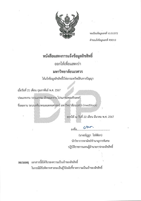 ขอแสดงความยินดีกับ มหาวิทยาลัยนเรศวร ในโอกาสได้รับการจดลิขสิทธิ์ ประเภทงาน วรรณกรรม ลักษณะงาน โปรแกรมคอมพิวเตอร์ medStock