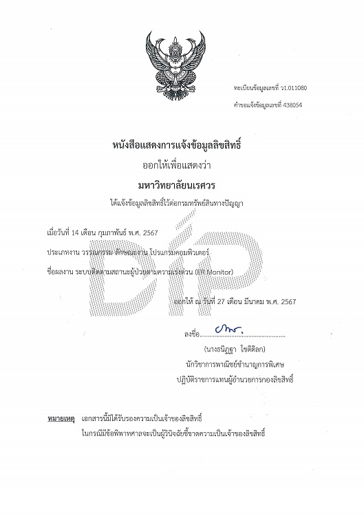 ขอแสดงความยินดีกับ มหาวิทยาลัยนเรศวร ในโอกาสได้รับการจดลิขสิทธิ์ ประเภทงาน วรรณกรรม ลักษณะงาน โปรแกรมคอมพิวเตอร์ ER Monitor
