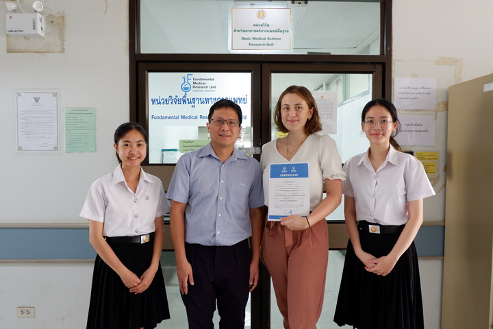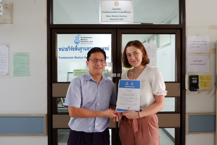 วันศุกร์ที่ 30 สิงหาคม 2567 เวลา 10.00 น. ผู้ช่วยศาสตราจารย์ นายแพทย์รวิสุต เดียวอิศเรศ รองคณบดีฝ่ายกิจการนิสิต คณะแพทยศาสตร์ มหาวิทยาลัยนเรศวร เป็นผู้แทนคณบดีมอบประกาศนียบัตรให้แก่ Miss Emma Christina จากคณะแพทยศาสตร์ University of Messina ประเทศอิตาลี ผู้เข้าร่วมศึกษาวิจัยเรื่อง Role of protein tyrosine kinases and phosphorylated proteins in T cell activation ซึ่งเป็นหัวข้อวิจัยในความรับผิดชอบของ ศาสตราจารย์ ดร.แพทย์หญิงสุธาทิพย์ พงษ์เจริญ โดยมีระยะเวลาในการปฏิบัติงาน ในระหว่างวันที่ 2 - 31 สิงหาคม 2567 ณ ห้องหน่วยวิจัยด้านวิทยาศาสตร์การแพทย์พื้นฐาน ชั้น 4 อาคารสิรินธร โรงพยาบาลมหาวิทยาลัยนเรศวร คณะแพทยศาสตร์ มหาวิทยาลัยนเรศวร