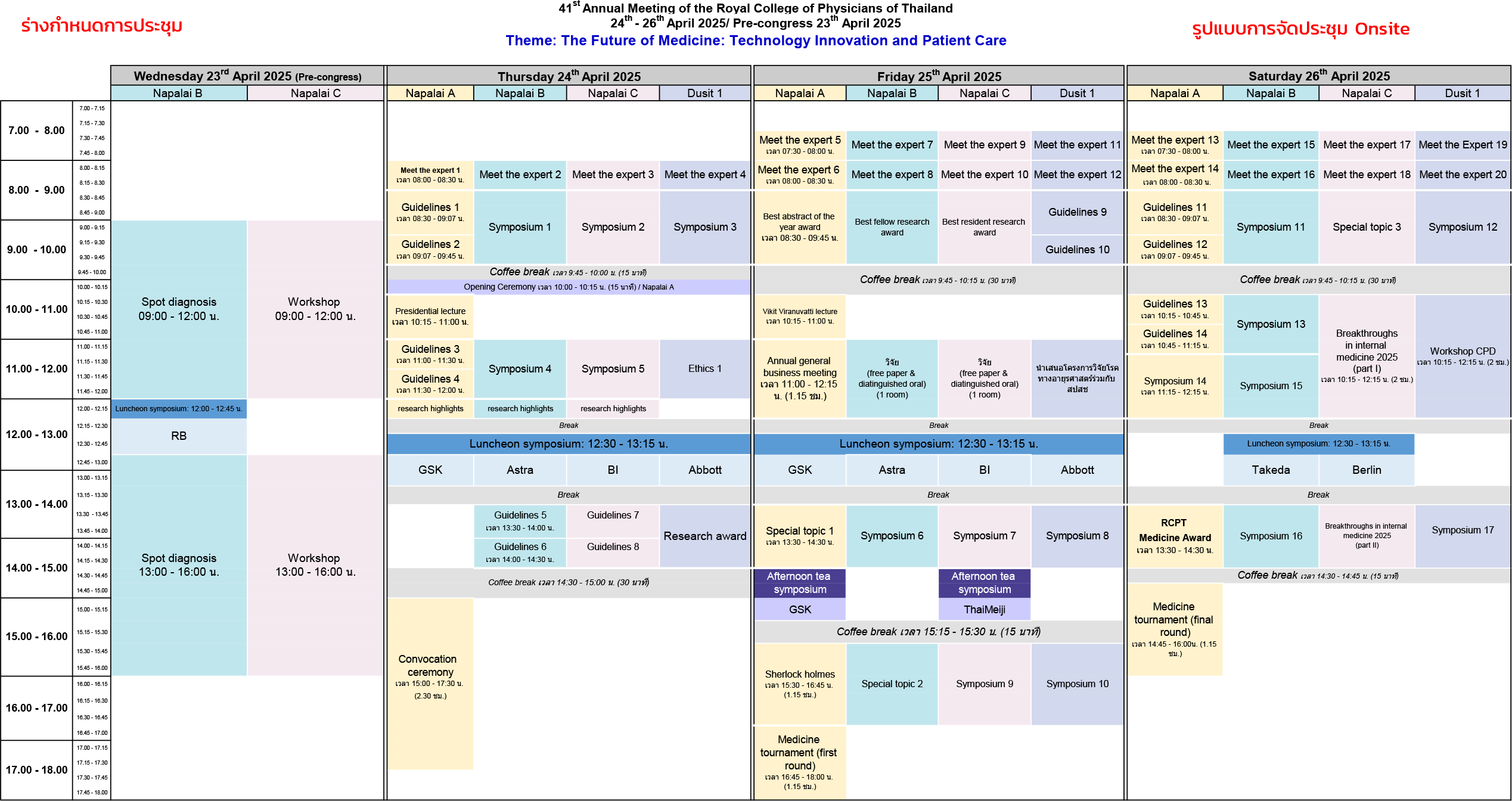 ราชวิทยาลัยอายุรแพทย์แห่งประเทศไทย จะจัดประชุมวิชาการ ครั้งที่ 41 ประจำปี 2568 ระหว่างวันที่ 24-26 เมษายน 2568 ณ โรงแรมดุสิตธานี พัทยา จ.ชลบุรี ภายใต้ธีม "The Future of Medicine : Technology Innovation and Patient Care"ในรูปแบบ On-site จึงจัดให้มีการจัดกิจกรรมการแข่งขันทางวิชาการ RCPT Medicine Award 2025โดยมีวัตถุประสงค์1. เพื่อเปิดโอกาสให้นิสิต/นักศึกษาแพทย์จากทั่วประเทศ เรียนรู้เนื้อหา มีความเข้าใจทางด้านอายุรศาสตร์เพิ่มมาขึ้น2. เสริมสร้างสัมพันธ์อันดีระหว่างนิสิต/นักศึกษาแพทย์ต่างสถาบันซึ่งการแข่งขันเป็นไปในรูปแบบ edutainment ผสานความรู้ทางวิชาการทางด้านอายุรศาสตร์และความสนุกสนานเข้าไว้ด้วยกัน เว็บไซต์อ้างอิง https://www2.rcpt.org/conference/2025/