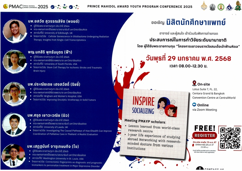 โครงการเยาวชนรางวัลสมเด็จเจ้าฟ้ามหิดลฯ ขอเชิญชวน นิสิตนักศึกษาแพทย์ อาจารย์ และผู้สนใจ เข้าร่วมรับฟังการถ่ายทอดประสบการณ์ในการทำวิจัยระดับนานาชาติ โดยผู้ได้รับพระราชทานทุน “โครงการเยาวชนรางวัลสมเด็จเจ้าฟ้ามหิดล”