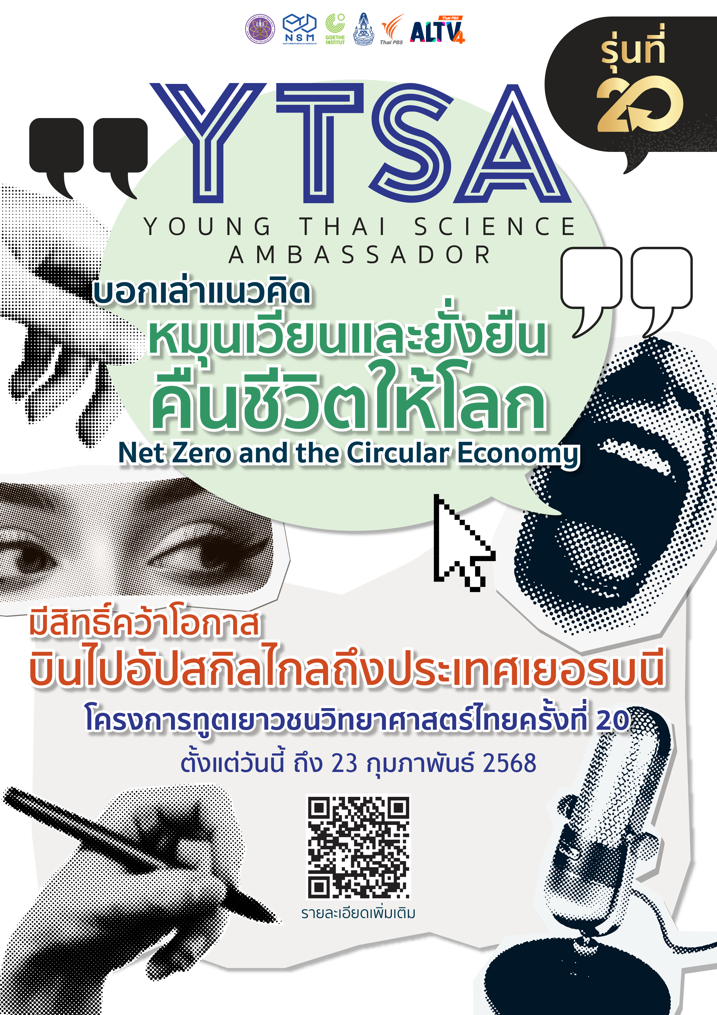 องค์การพิพิธภัณฑ์วิทยาศาสตร์แห่งชาติ (อพวช.) กระทรวงการอุดมศึกษา วิทยาศาสตร์ วิจัยและนวัตกรรม ร่วมกับสมาคมวิทยาศาสตร์แห่งประเทศไทยในพระบรมราชูปถัมภ์ และสถาบันเกอเธ่ ประเทศไทย ได้กำหนดจัดโครงการทูตเยาวชนวิทยาศาสตร์ไทย ครั้งที่ 20 ขึ้น (Young Thai Science Ambassador #20)โดยกำหนดให้เยาวชนนักสื่อสารวิทยาศาสตร์ถ่ายทอดเรื่องราววิทยาศาสตร์ เทคโนโลยี และนวัตกรรมในแง่มุมต่าง ๆ ในหัวข้อ “หมุนเวียนและยั่งยืน คืนชีวิตให้โลก – Net Zero and the Circular Economy”เยาวชนจะต้องนำเสนอ “เรื่องราวเกี่ยวกับวิทยาศาสตร์ เทคโนโลยีและนวัตกรรม จากผลงานวิจัย การทดลอง ผลิตภัณฑ์ นวัตกรรมที่มีการพัฒนาขึ้นมา มีผลตามกระบวนการทางวิทยาศาสตร์ที่ช่วยแก้ปัญหาการเปลี่ยนแปลงสภาพภูมิอากาศที่เกิดจากการปล่อยก๊าซเรือนกระจก และแนวทางแก้ไขปัญหาด้วยหลักการของเศรษฐกิจหมุนเวียน” สามารถสมัครตั้งแต่วันนี้ - 23 กุมภาพันธ์ 2568อ่านรายละเอียดเพิ่มเติมตามเอกสารแนบเว็บไซต์ อพวช. : https://www.nsm.or.th/nsm/th/ytsa