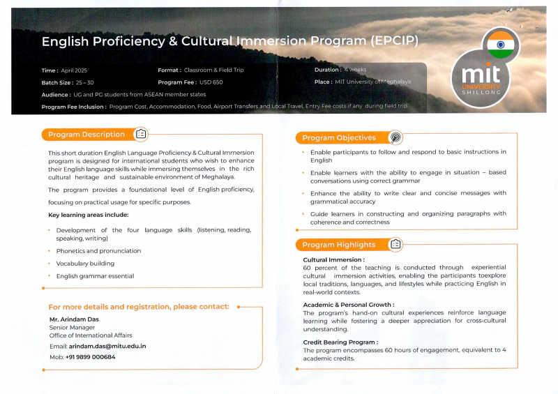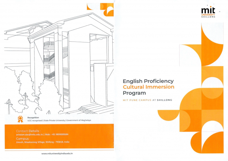 มหาวิทยาลัย MIT University of Meghalaya เมืองซิลลอง รัฐเมฆาลัย สาธารณรัฐอินเดีย ประชาสัมพันธ์หลักสูตร English Proficiency & Cultural Immersion Program (EPCIP)