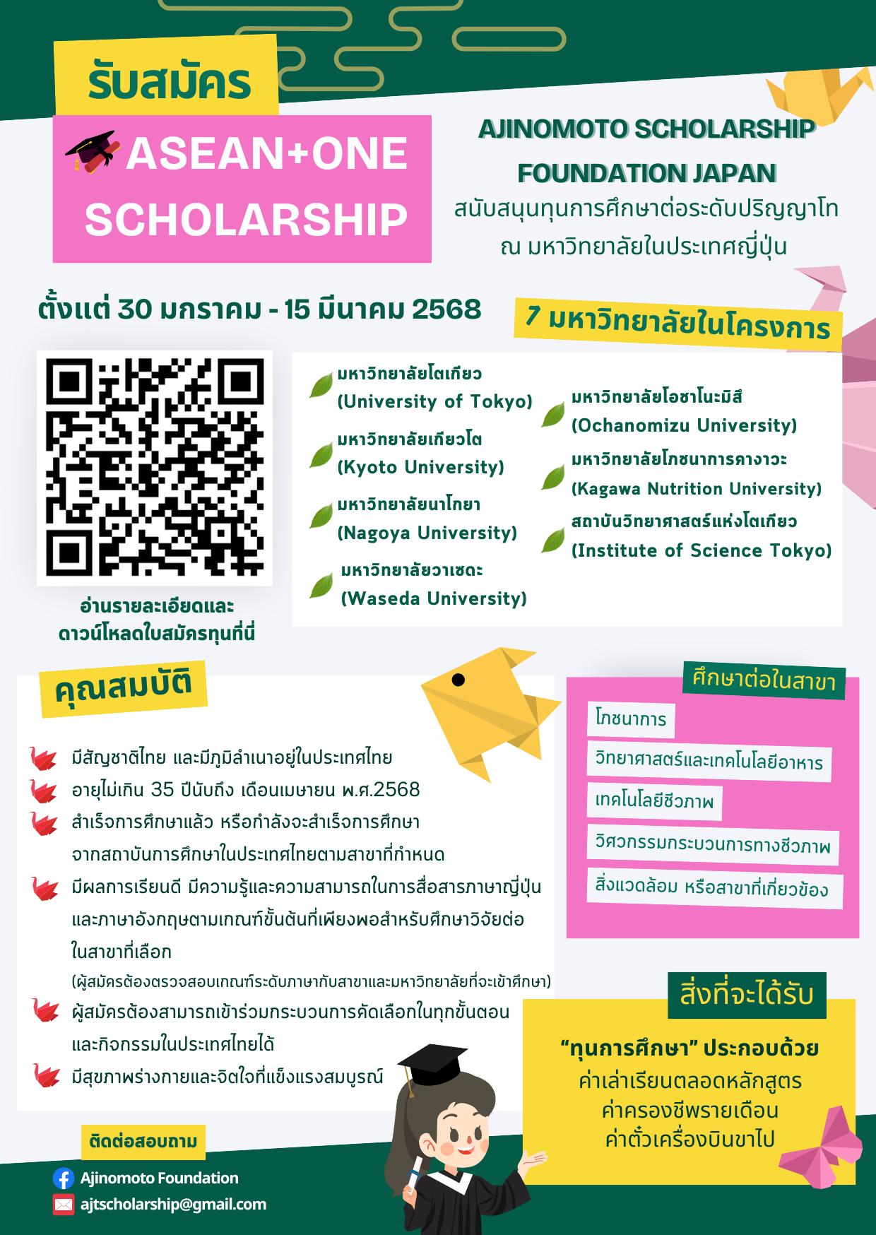 ด้วยมูลนิธิทุนการศึกษาอายิโนะโมะโต๊ะ ประเทศญี่ปุ่น ประชาสัมพันธ์การมอบทุนการศึกษาภายใต้โครงการ “ASEAN+ONE Scholarship” ประจำปีการศึกษา 2569 ซึ่งเป็นทุนให้เปล่าและไม่มีข้อผูกมัด เพื่อศึกษาต่อระดับปริญญาโทในสาขาโภชนาการ วิทยาศาสตร์และเทคโนโลยีอาหาร เทคโนโลยีชีวภาพ วิศวรรมกระบวนการทางชีวภาพ สิ่งแวดล้อม หรือสาขาที่เกี่ยวข้อง ณ มหาวิทยาลัยชั้นนำในประเทศญี่ปุ่น จำนวน 7 แห่ง ** โดยปิดรับสมัครภายในวันที่ 15 มีนาคม 2568 **