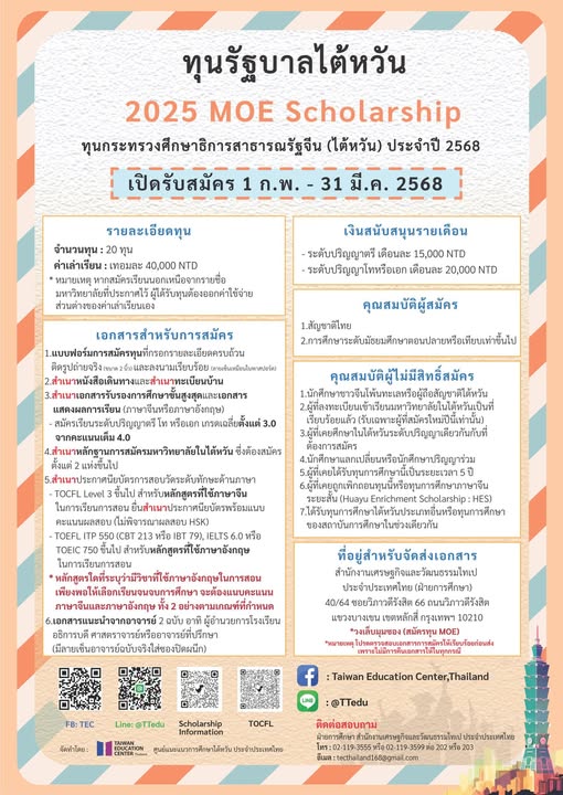 กระทรวงศึกษาธิการสาธารณรัฐจีน (ไต้หวัน)ประชาสัมพันธ์ทุนให้แก่นิสิตนักศึกษาในระดับปริญญาตรี โทและเอก  ภายใต้โครงการ “2025 Taiwan Scholarship Program Directions for Thai Students”