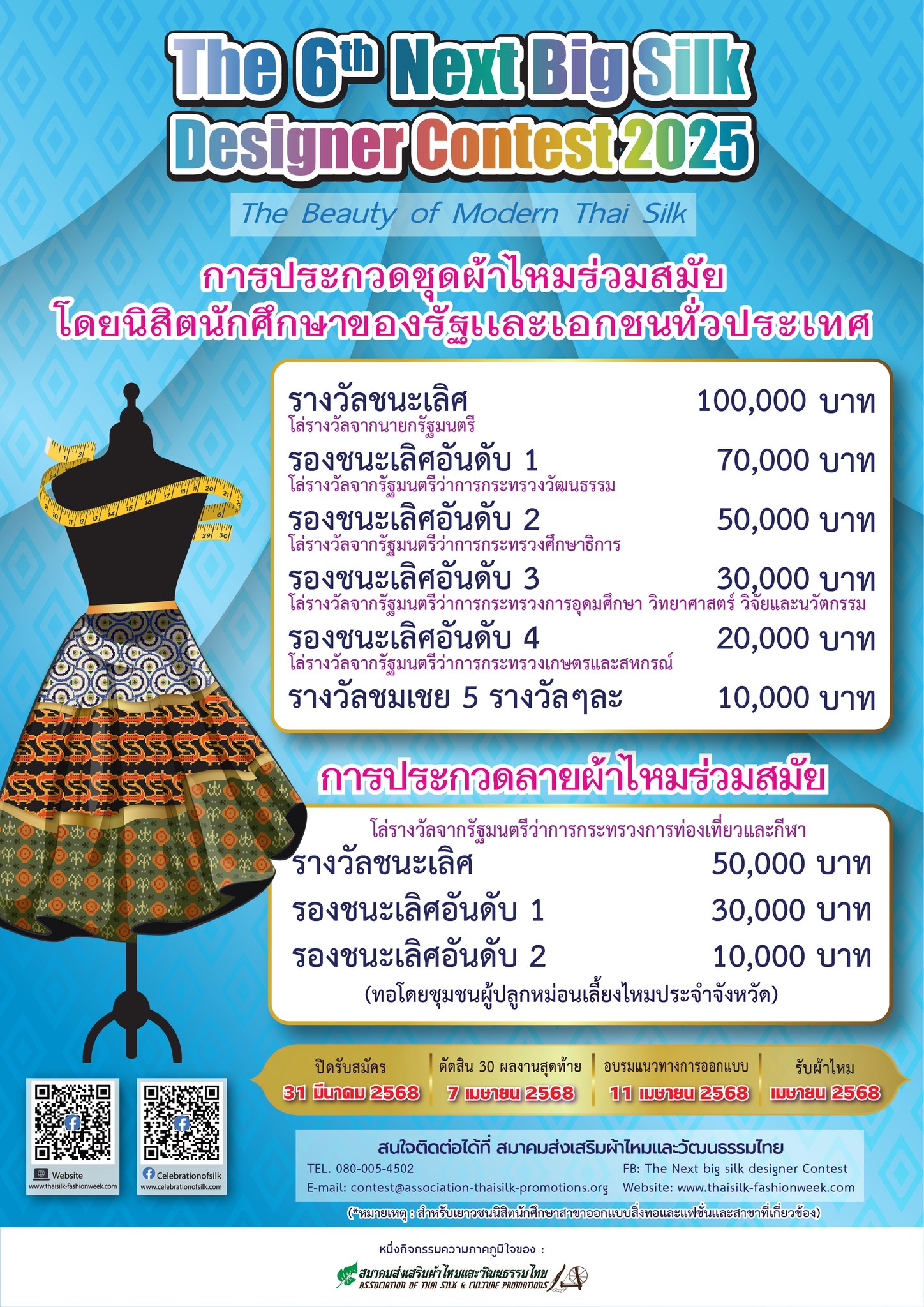 สมาคมส่งเสริมผ้าไหมและวัฒนธรรมไทย ประชาสัมพันธ์กิจกรรมการประกวดออกแบบชุดผ้าไหมไทยร่วมสมัย ในการประกวด The 6th Next Big Silk Designer Contest 2025 ในโครงการแฟชั่นวีคผ้าไหมไทยนานาชาติ** สมัครตั้งแต่วันนี้ - 31 มีนาคม 2568ติดตามข่าวสารเพิ่มเติม : https://www.facebook.com/p/The-Next-Big-Silk-Designer-Contest-100087120640682/