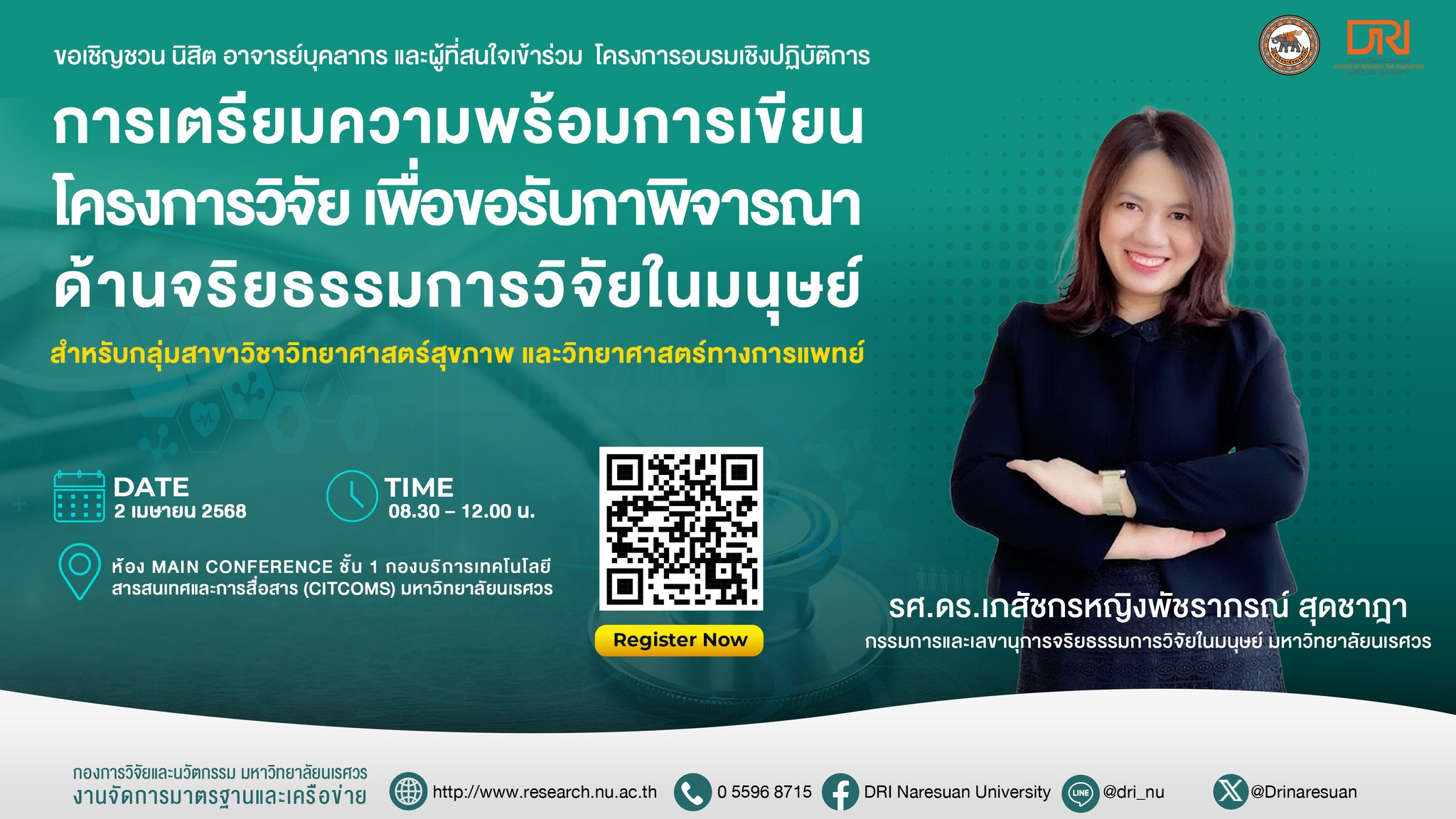 ขอเชิญชวน นิสิต อาจารย์บุคลากร และผู้ที่สนใจเข้าร่วม (1) โครงการอบรมเชิงปฏิบัติการ : การเตรียมความพร้อมการเขียนโครงการวิจัยเพื่อขอรับการพิจารณาด้านจริยธรรมการวิจัยในมนุษย์ สำหรับกลุ่มสาขาวิชาวิทยาศาสตร์สุขภาพ** ในวันที่ 1 เมษายน 2568 เวลา 08.30 - 12.00 น. **(2) โครงการอบรมเชิงปฏิบัติการ: การเตรียมความพร้อมการเขียนโครงการวิจัยเพื่อขอรับการพิจารณาด้านจริยธรรมการวิจัยในมนุษย์ สำหรับกลุ่มสาขาวิชาวิทยาศาสตร์สุขภาพ และวิทยาศาสตร์ทางการแพทย์** ในวันที่ 1 เมษายน 2568 เวลา 08.30 - 12.00 น. **