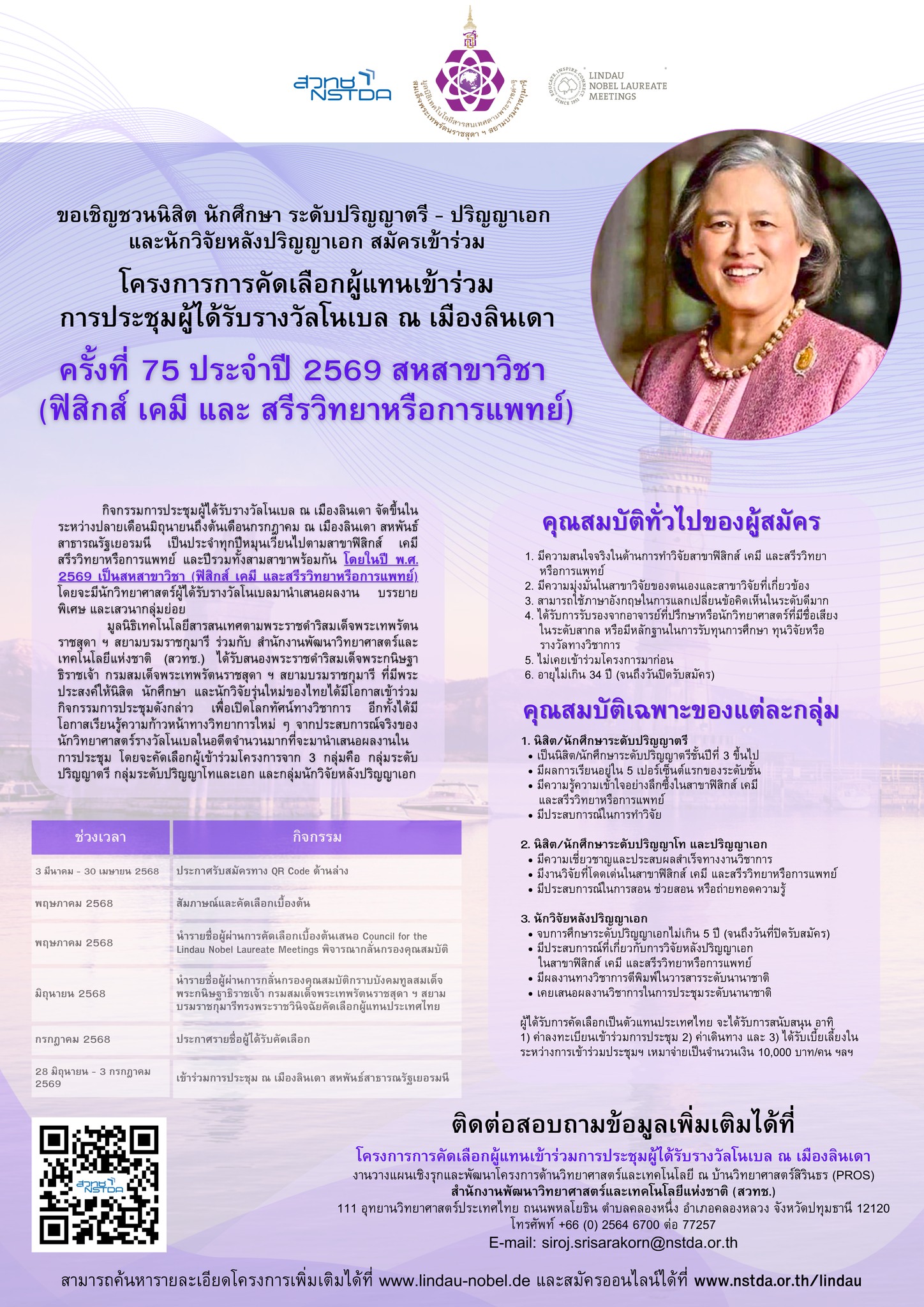 มูลนิธิเทคโนโลยีสารสนเทศตามพระราชดำริสมเด็จพระเทพรัตนราชสุดา ฯ สยามบรมราชกุมารี ร่วมกับ สำนักงานพัฒนาวิทยาศาสตร์และเทคโนโลยีแห่งชาติ (สวทช.) เปิดรับสมัครเพื่อคัดเลือกนิสิต นักศึกษา ระดับชั้นปริญญาตรี - เอก และนักวิจัยหลังปริญญาเอก เพื่อรับการคัดเลือกเป็นตัวแทนประเทศไทยไปร่วมการประชุมผู้ได้รับรางวัลโนเบล ณ เมืองลินเดา สหพันธ์สาธารณรัฐเยอรมนี ประจำปี 2569 (สหสาขาวิชา: ฟิสิกส์ เคมี และ สรีรวิทยาหรือการแพทย์) ** สมัครเข้ารับการคัดเลือก ตั้งแต่วันนี้ - 30 เมษายน 2568 **เว็บไซต์เพิ่มเติม : https://shorturl.at/8t7al