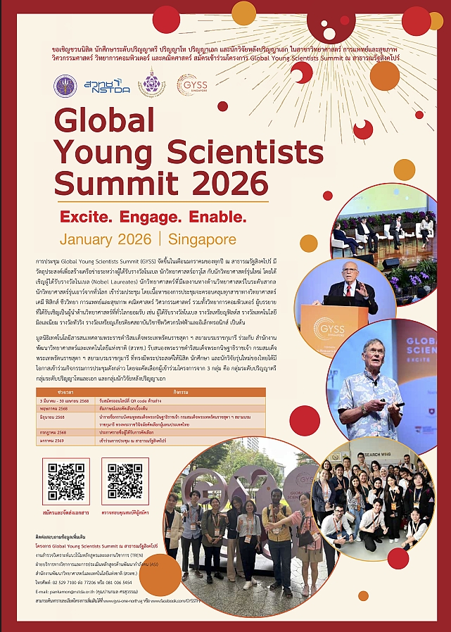 มูลนิธิเทคโนโลยีสารสนเทศตามพระราชดำริสมเด็จพระเทพรัตนราชสุดา ฯ สยามบรมราชกุมารี ร่วมกับ สำนักงานพัฒนาวิทยาศาสตร์และเทคโนโลยีแห่งชาติ (สวทช.) เปิดรับสมัครเพื่อคัดเลือกนิสิต นักศึกษา ระดับชั้นปริญญาตรี - เอก และนักวิจัยหลังปริญญาเอก เพื่อรับการคัดเลือกเป็นตัวแทนประเทศไทยไปร่วมการประชุม Global Young Scientists Summit (GYSS) ณ สาธารณรัฐสิงคโปร์ ประจำปี 2569** สมัครเข้ารับการคัดเลือก ตั้งแต่วันนี้ - 30 เมษายน 2568 **เว็บไซต์ : https://www.nstda.or.th/lindau/pdys-4/index.php