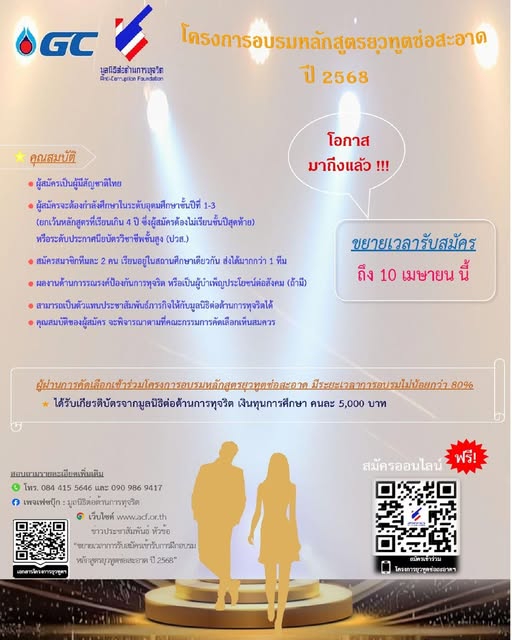 มูลนิธิต่อต้านการทุจริต ขยายเวลาการับสมัครนิสิตเข้าร่วมโครงการอบรมหลักสูตรยุวทูตช่อสะอาด ปี 2568 ** ออกไปจนถึงวันที่ 10 เมษายน 2568 **สมัครเข้าร่วมโครงการ : https://shorturl.at/jwE0N