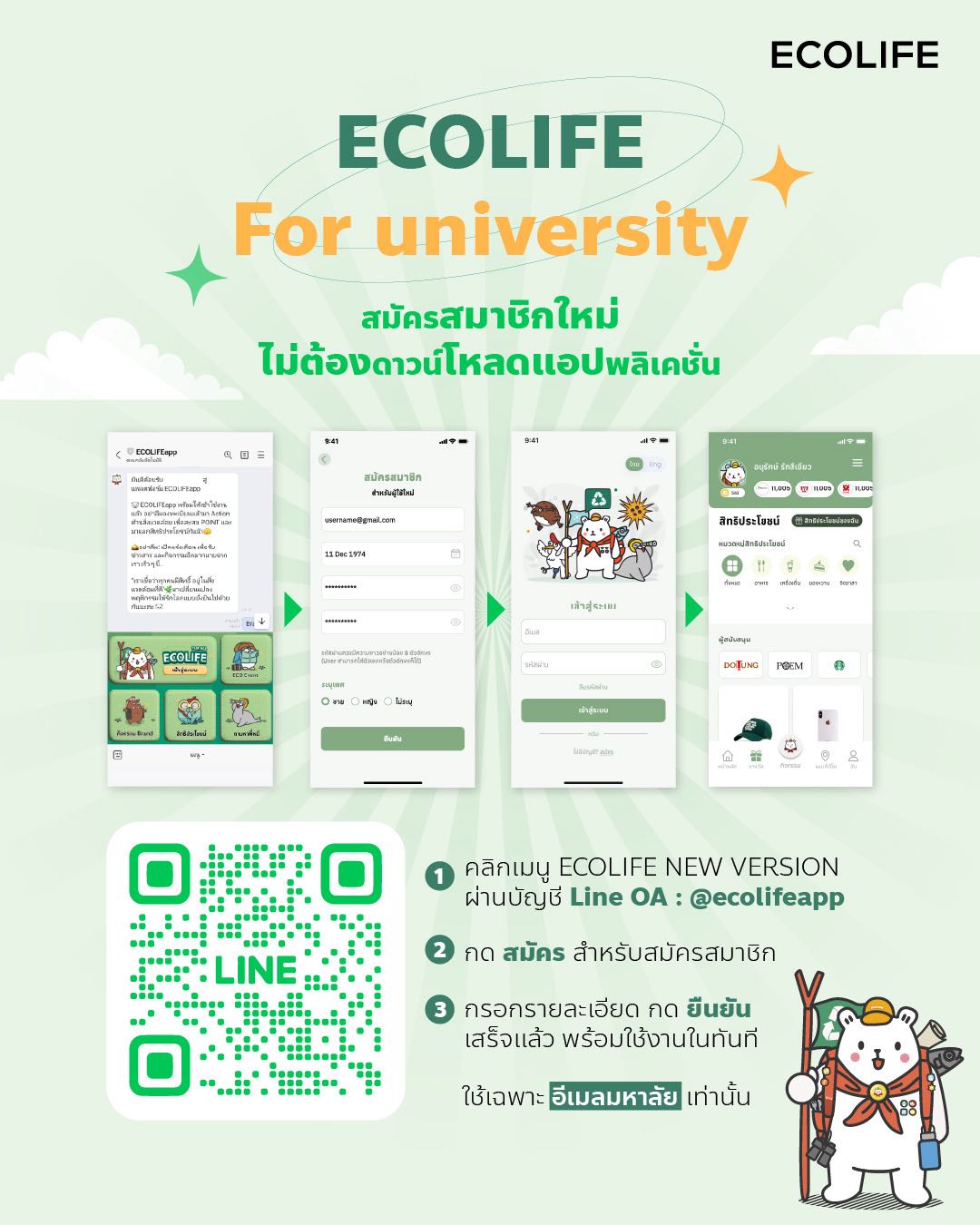 กระทรวงการอุดมศึกษาฯ ร่วมกับ บ. คิด คิด จำกัด ขอความอนุเคราะห์ทางมหาวิทยาลัยให้ความร่วมมือในการให้นิสิตเข้าร่วมกิจกรรมเพื่อรวบรวมคะแนนจากการเข้าร่วมโครงการ ECOLIFE in U เพื่อสะสมคะแนนนำไปแลกชั่วโมงจิตสาธราณะและคะแนนในรายวิชาที่เกี่ยวข้อง โดยการนำบัญชีผู้ใช้งาน E-Mail ของนิสิต มาสมัครเข้าใช้งานแพลตฟอร์ม ECOLIFE เว็บไซต์ : https://ecolifeapp.com/
