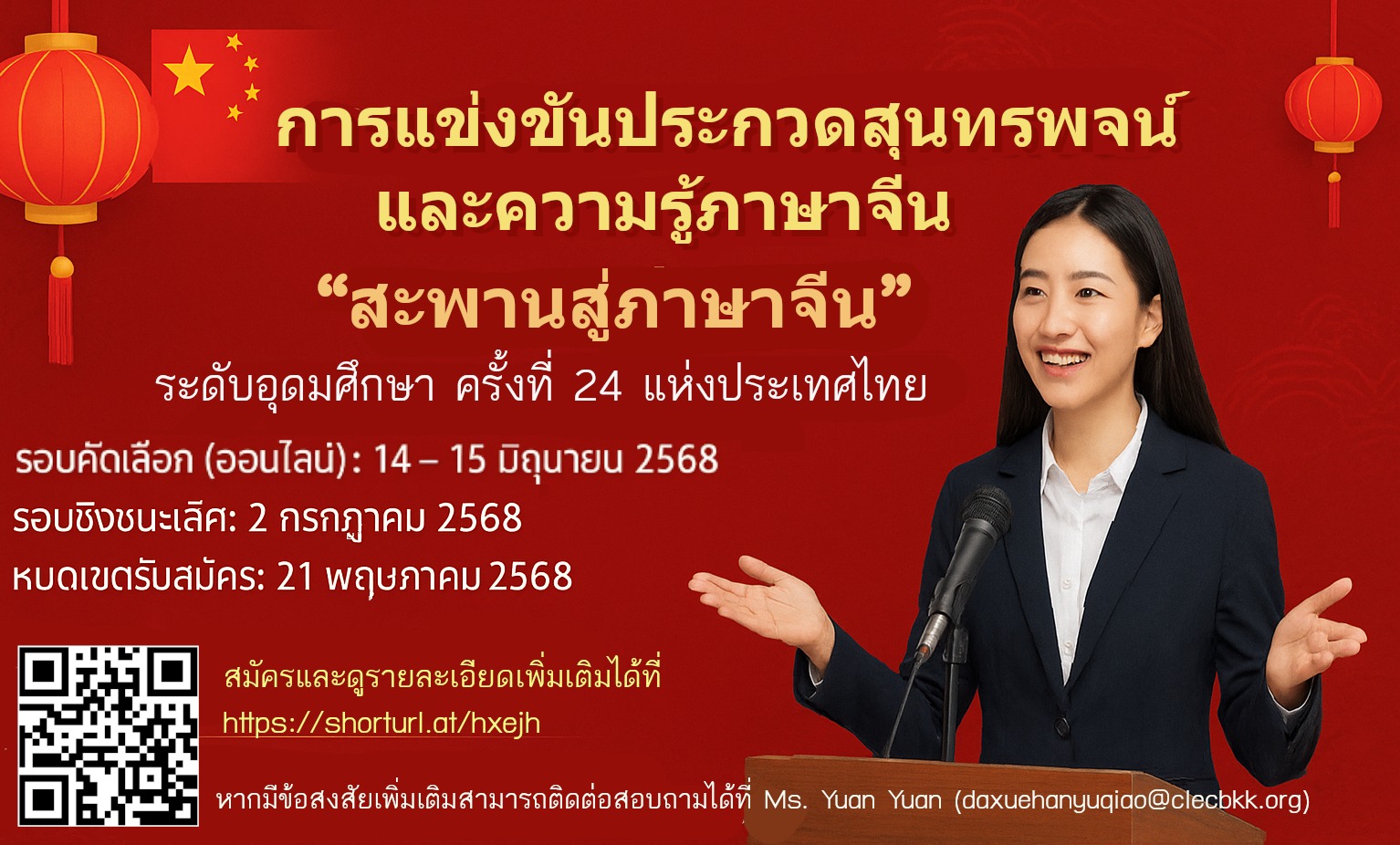 สถานเอกอัครราชทูตสาธารณรัฐประชาชนจีนประจำประเทศไทยร่วมกับกระทรวง การอุดมศึกษาวิทยาศาสตร์ วิจัยและนวัตกรรม และศูนย์แลกเปลี่ยนและส่งเสริมความร่วมมือด้าน ภาษาจีนระหว่างประเทศ (Center for Language Education and Cooperation: CLEC) ได้ดำเนินโครงการประกวดสุนทรพจน์และความรู้ภาษาจีนระดับอุดมศึกษาเป็นประจำทุกปี เพื่อคัดเลือกนักศึกษาไทยเดินทางไปประกวดสุนทรพจน์ภาษาจีนระดับนานาชาติ ณ สาธารณรัฐประชาชนจีน โดยในปี 2568 การแข่งขันประกวดสุนทรพจน์และความรู้ภาษาจีน “สะพานสู่ภาษาจีน” ระดับอุดมศึกษา ครั้งที่ 24 แห่งประเทศไทย จะแบ่งการแข่งขันออกเป็น 2 รอบ ดังนี้ 1) การแข่งขันรอบคัดเลือก ในรูปแบบออนไลน์ มีกำหนดจัดระหว่างวันที่ 14 - 15 มิถุนายน 2568 2) การแข่งขันรอบชิงชนะเลิศระดับประเทศ มีกำหนดจัดในวันที่ 2กรกฎาคม 2568 โดยทาง CLEC จะแจ้งสถานที่ในการแข่งขันรอบชิงชนะเลิศ ระดับประเทศให้ผู้เข้าร่วมการประกวดทราบในโอกาสต่อไป** สมัครภายในวันที่ 21 พฤษภาคม 2568 **