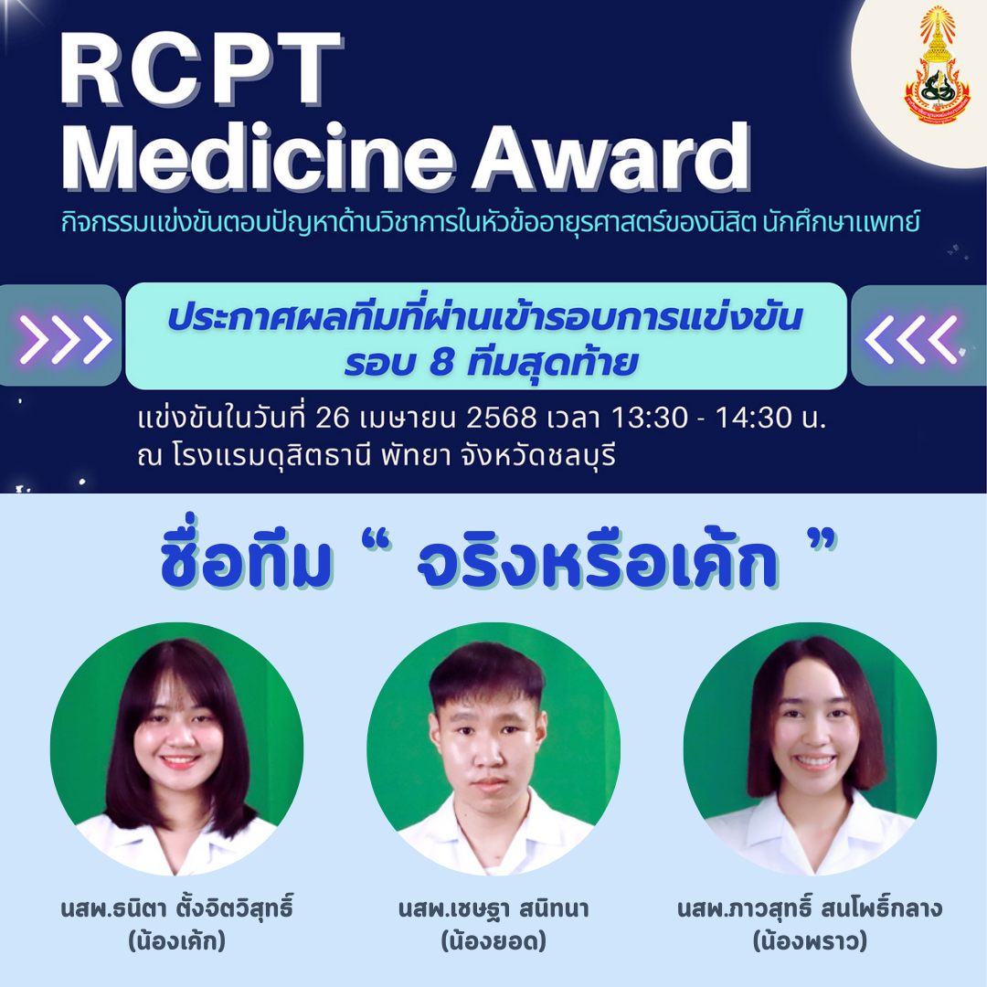 เมื่อวันที่ 26 เมษายน 2568 ตัวแทนนิสิตแพทย์ มหาวิทยาลัยนเรศวร เข้าร่วม RCPT Medicine Award กิจกรรมแข่งขันตอบปัญหาวิชาการด้านอายุรศาสตร์ ณ โรงแรมดุสิตธานี พัทยา จังหวัดชลบุรี จัดขึ้นโดยราชวิทยาลัยอายุรแพทย์แห่งประเทศไทย ภายใต้ธีม "The Future of Medicine : Technology Innovation and Patient Care"