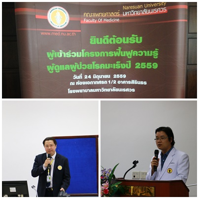 วันที่ 24 มิถุนายน 2559 ศูนย์มะเร็ง โรงพยาบาลมหาวิทยาลัยนเรศวร ร่วมกับ ภาควิชาอายุรศาสตร์ คณะแพทยศาสตร์ มหาวิทยาลัยนเรศวร จัดโครงการฟื้นฟูความรู้ผู้ดูแลผู้ป่วยโรคมะเร็ง ปี 2559 ณ ห้องประชุมเอกาทศรถ 1,2 ชั้น 3 อาคารสิรินธรโรงพยาบาลมหาวิทยาลัยนเรศวร