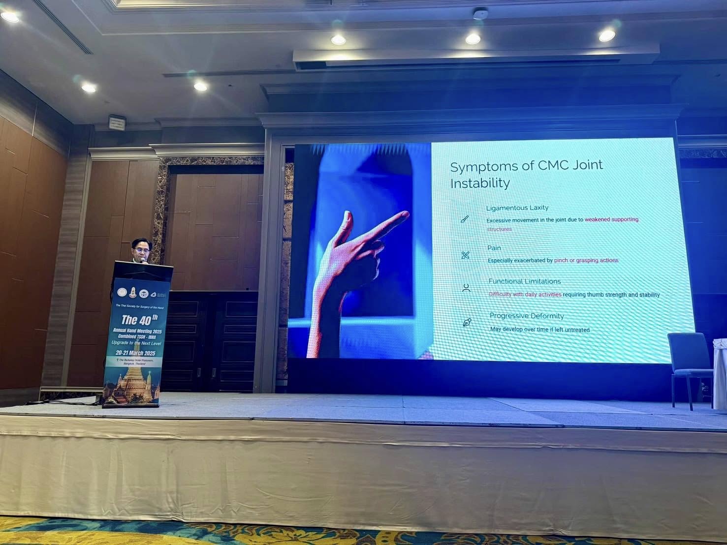 อ.นพ.ศรัณย์ มะลิซ้อน หัวหน้าภาควิชาออร์โธปิดิกส์ ได้รับเชิญให้บรรยายหัวข้อ “CMC instability” ในงานประชุม ”The 40th Annual Hand Meeting 2025 - Combined TSSH - IBRA” ซึ่งเป็นงานประชุมวิชาการประจำปีของชมรมจุลศัลยแพทย์แห่งประเทศไทย และชมรมศัลยแพทย์ทางมือแห่งประเทศไทย จัดขึ้นระหว่างวันที่ 20-21 มีนาคม 2568 ที่ผ่านมา ณ โรงแรม The Berkeley ประตูน้ำ กรุงเทพฯ