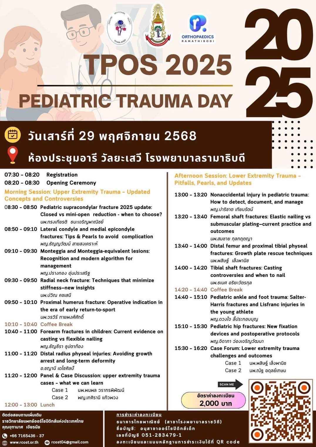 เมื่อวันที่ 29 พฤศจิกายน 2568 อนุสาขาออร์โธปิดิกส์เด็ก ราชวิทยาลัยแพทย์ออร์โธปิดิกส์แห่งประเทศไทย ได้จัดการประชุมวิชาการ TPOS 2025: Pediatric Trauma Day ณ โรงพยาบาลรามาธิบดี กรุงเทพฯ โดยมีแพทย์ผู้เชี่ยวชาญจากทั่วประเทศเข้าร่วมแลกเปลี่ยนความรู้และประสบการณ์ด้านการดูแลผู้ป่วยอุบัติเหตุในเด็ก