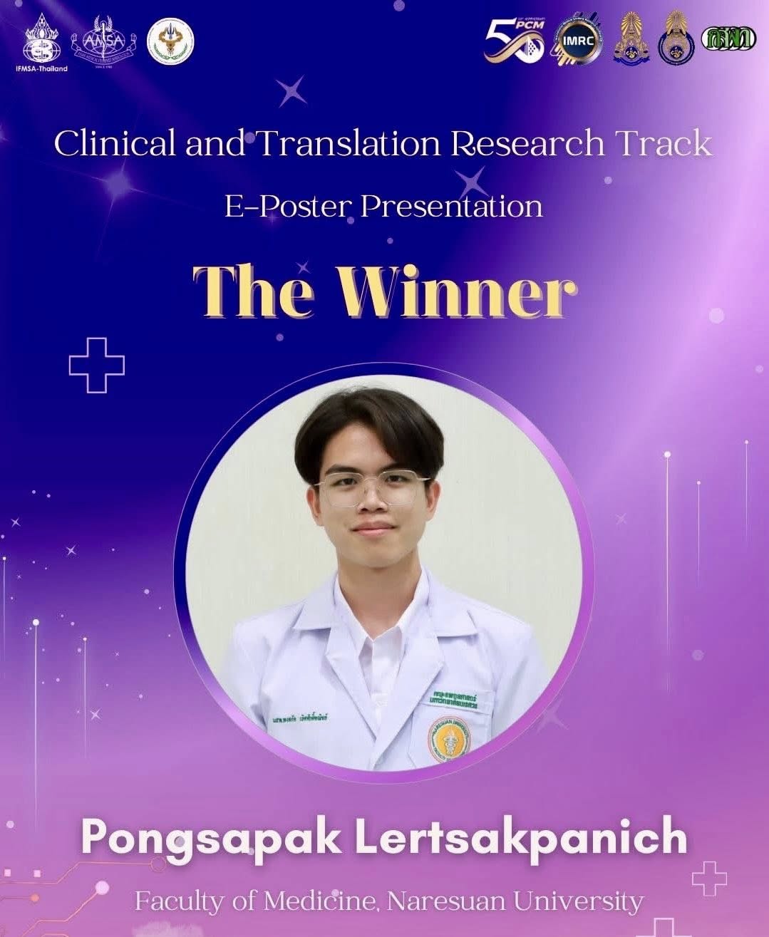 ขอแสดงความยินดีกับ นิสิตแพทย์พงศภัค เลิศศักดิ์พณิชย์ นิสิตแพทย์ชั้นปีที่ 4 ที่ได้รับรางวัลชนะเลิศ การนำเสนอผลงานวิจัยประเภทโปสเตอร์ ในงานประชุมวิชาการนานาชาติ International Medical Student Research Conference (IMRC 2025) ซึ่งจัดขึ้นระหว่างวันที่ 13-14 ธันวาคม 2568 ณ วิทยาลัยแพทยศาสตร์พระมงกุฎเกล้า กรุงเทพฯ