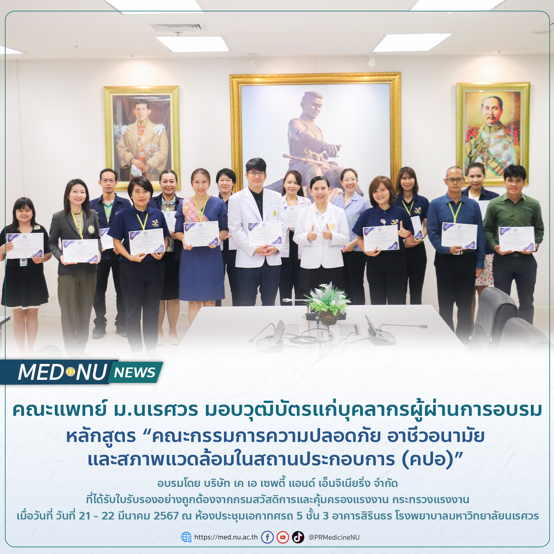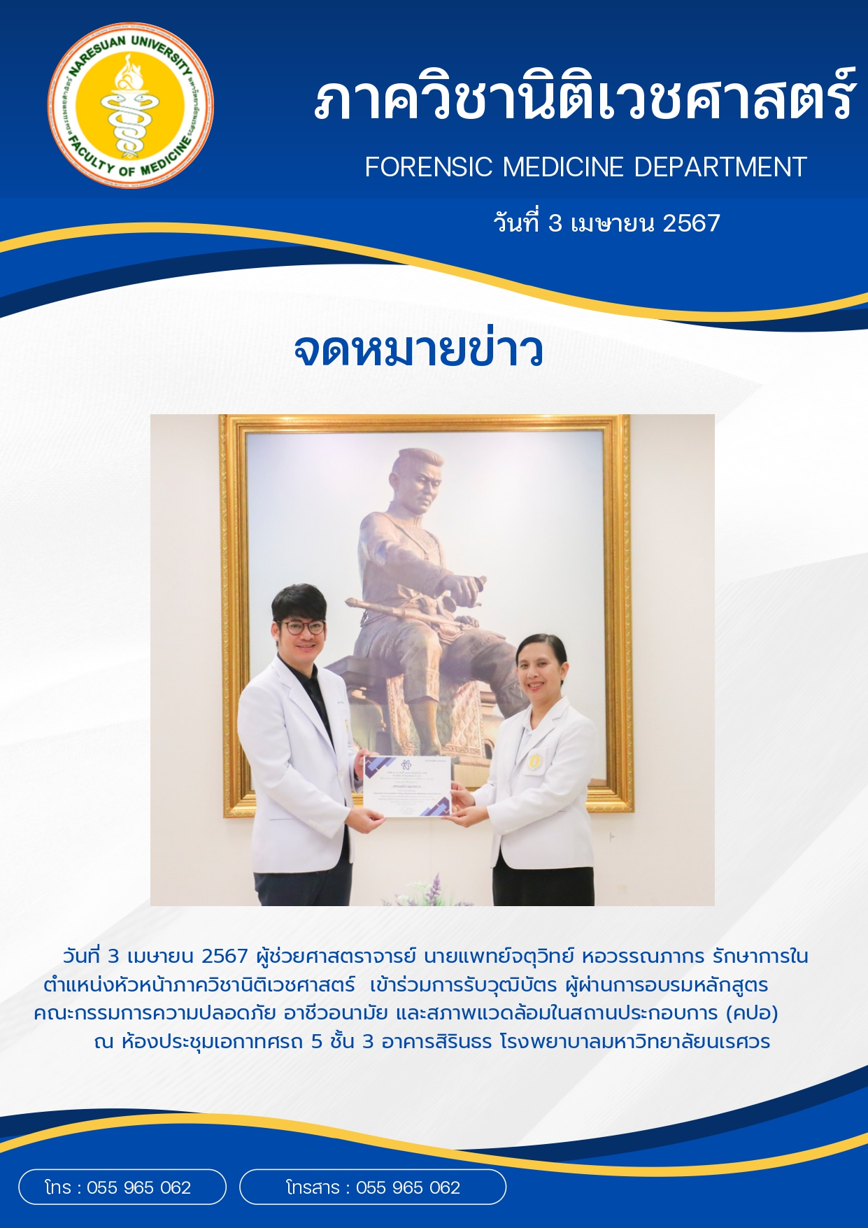 วันที่ 3 เมษายน 2567 ผู้ช่วยศาสตราจารย์ นายแพทย์จตุวิทย์ หอวรรณภากร รักษาการในตำแหน่งหัวหน้าภาควิชานิติเวชศาสตร์ เข้าร่วมการรับวุฒิบัตร ผู้ผ่านการอบรมหลักสูตร คณะกรรมการความปลอดภัย อาชีวอนามัย และสภาพแวดล้อมในสถานประกอบการ (คปอ) ณ ห้องประชุมเอกาทศรถ 5 ชั้น 3 อาคารสิรินธร โรงพยาบาลมหาวิทยาลัยนเรศวร