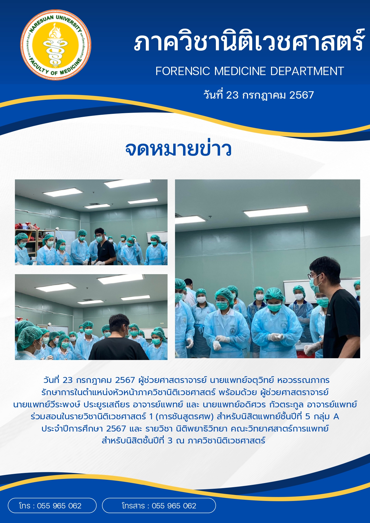 วันที่ 23 กรกฎาคม 2567 ผู้ช่วยศาสตราจารย์ นายแพทย์จตุวิทย์ หอวรรณภากร รักษาการในตำแหน่งหัวหน้าภาควิชานิติเวชศาสตร์ พร้อมด้วย ผู้ช่วยศาสตราจารย์ นายแพทย์วีระพงษ์ ประยูรเสถียร อาจารย์แพทย์ และ นายแพทย์อดิศวร กัวตระกูล อาจารย์แพทย์ ร่วมสอนในรายวิชานิติเวชศาสตร์ 1 (การชันสูตรศพ) สำหรับนิสิตแพทย์ชั้นปีที่ 5 กลุ่ม A ประจำปีการศึกษา 2567 และ รายวิชา นิติพยาธิวิทยา คณะวิทยาศสาตร์การแพทย์ สำหรับนิสิตชั้นปีที่ 3 ณ ภาควิชานิติเวชศาสตร์
