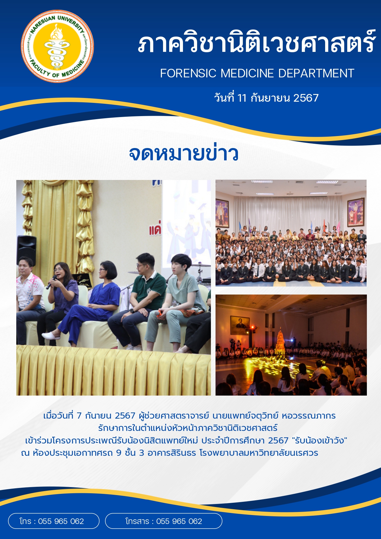 เมื่อวันที่ 7 กันายน 2567 ผู้ช่วยศาสตราจารย์ นายแพทย์จตุวิทย์ หอวรรณภากร รักษาการในตำแหน่งหัวหน้าภาควิชานิติเวชศาสตร์ เข้าร่วมโครงการประเพณีรับน้องนิสิตแพทย์ใหม่ ประจำปีการศึกษา 2567 "รับน้องเข้าวัง" ณ ห้องประชุมเอกาทศรถ 9 ชั้น 3 อาคารสิรินธร โรงพยาบาลมหาวิทยาลัยนเรศวร