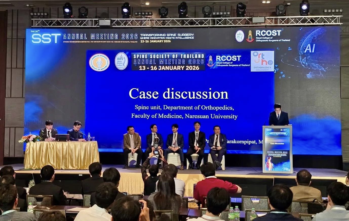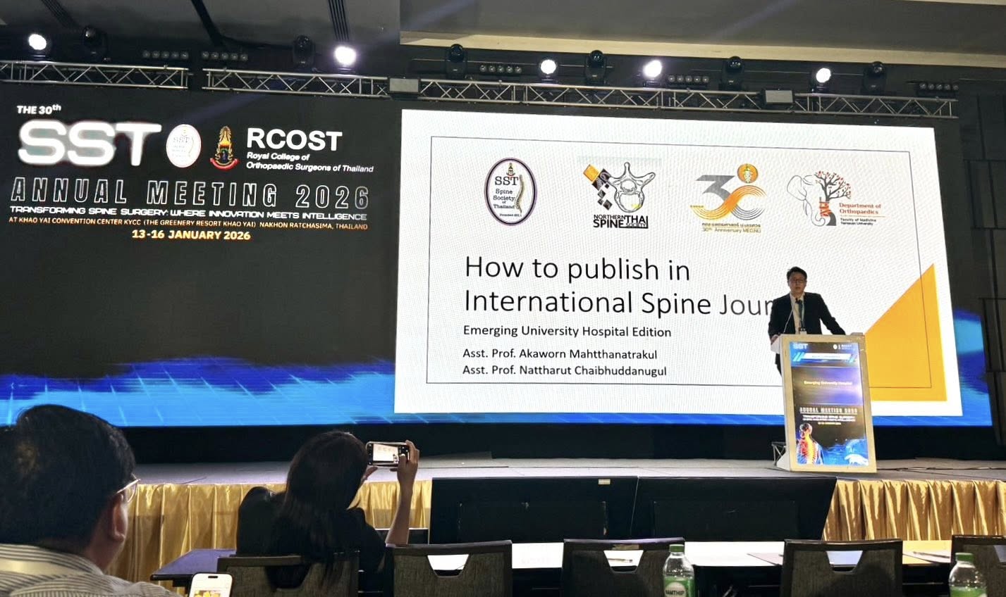 คณาจารย์อนุสาขาการผ่าตัดกระดูกสันหลัง ภาควิชาออร์โธปิดิกส์ คณะแพทยศาสตร์ มหาวิทยาลัยนเรศวร ได้เข้าร่วมประชุมและได้รับเกียรติให้บรรยายในงานประชุมวิชาการประจำปีของอนุสาขาโรคกระดูกสันหลัง ราชวิทยาลัยแพทย์ออร์โธปิดิกส์แห่งประเทศไทย “The 30th Spine Society of Thailand Annual Meeting 2026” ระหว่างวันที่ 13–16 มกราคม 2569 ณ ศูนย์ประชุม Khao Yai Convention Center (KYCC) จังหวัดนครราชสีมา