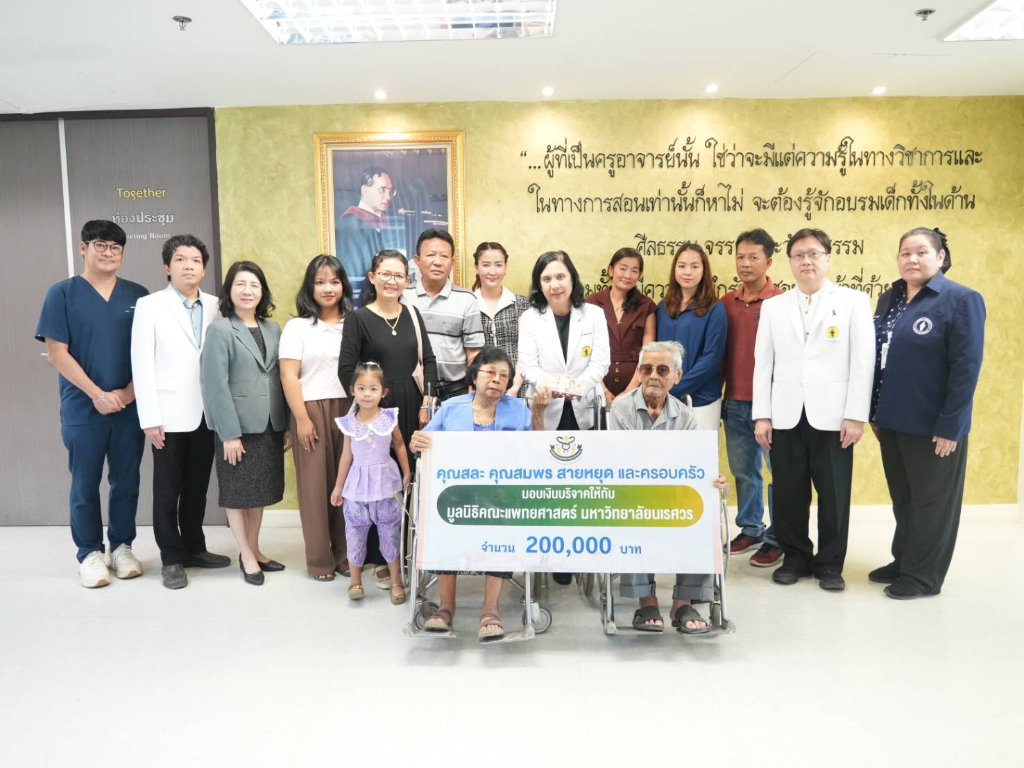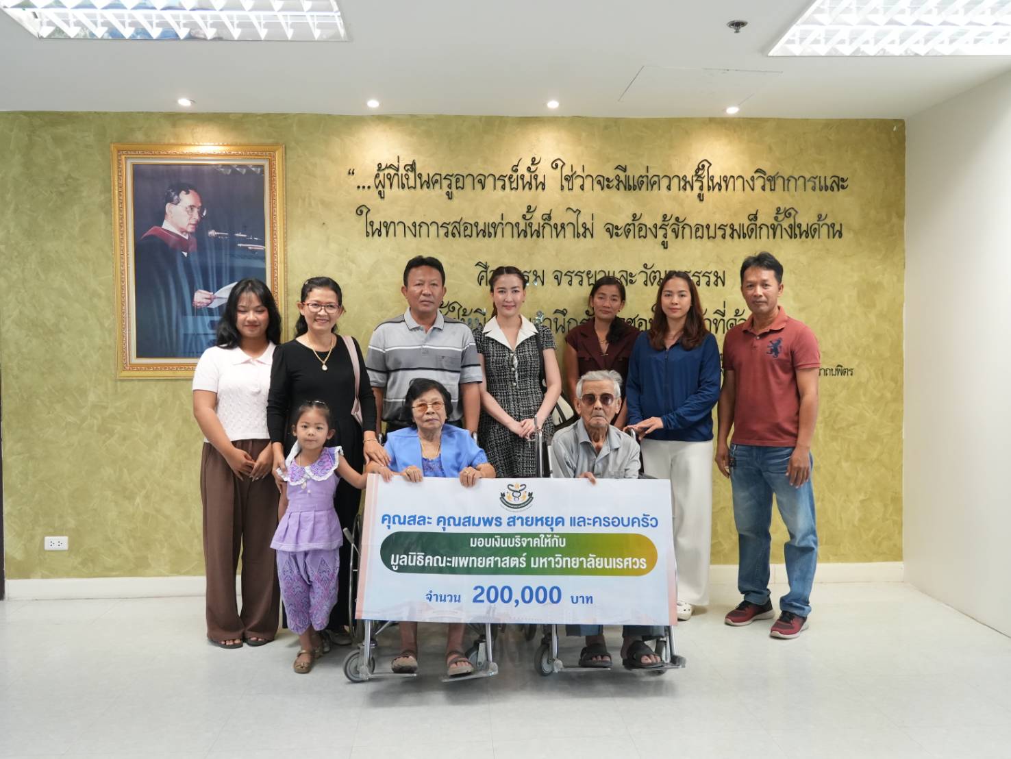 เมื่อวันที่ 5 มีนาคม 2569 เวลา 11:00 น. ผู้ช่วยศาสตราจารย์แพทย์หญิงพิริยา นฤขัตรพิชัย คณบดีคณะแพทยศาสตร์ ประธานมูลนิธิคณะแพทยศาสตร์มหาวิทยาลัยนเรศวร พร้อมทีมบริหาร รับมอบเงินบริจาคจาก นายสละ นางสมพร สายหยุด และครอบครัว จำนวน 200,000 บาท(สองแสนบาทถ้วน) ซึ่งถือเป็นรายแรกของการบริจาคเงินเพื่อมูลนิธิคณะแพทยศาสตร์ มหาวิทยาลัยนเรศวร นับตั้งแต่ก่อตั้งมูลนิธิคณะแพทยศาสตร์ มหาวิทยาลัยนเรศวร ทางมูลนิธิต้องขอขอบพระคุณท่านผู้มีจิตศรัทธามา ณ โอกาสนี้