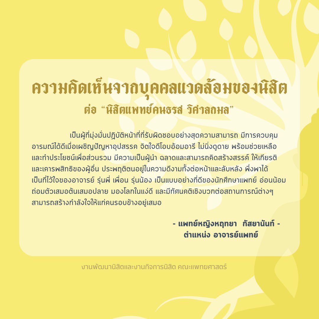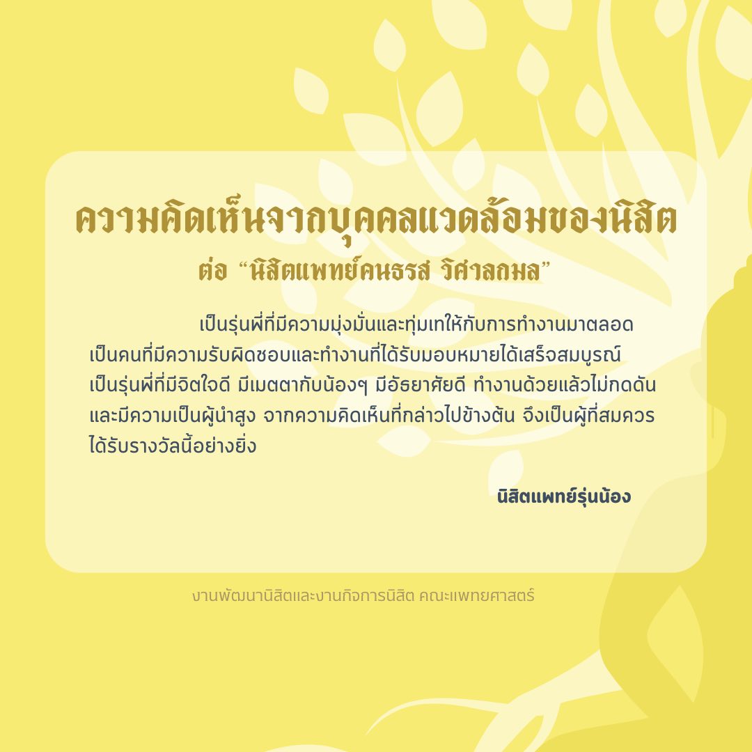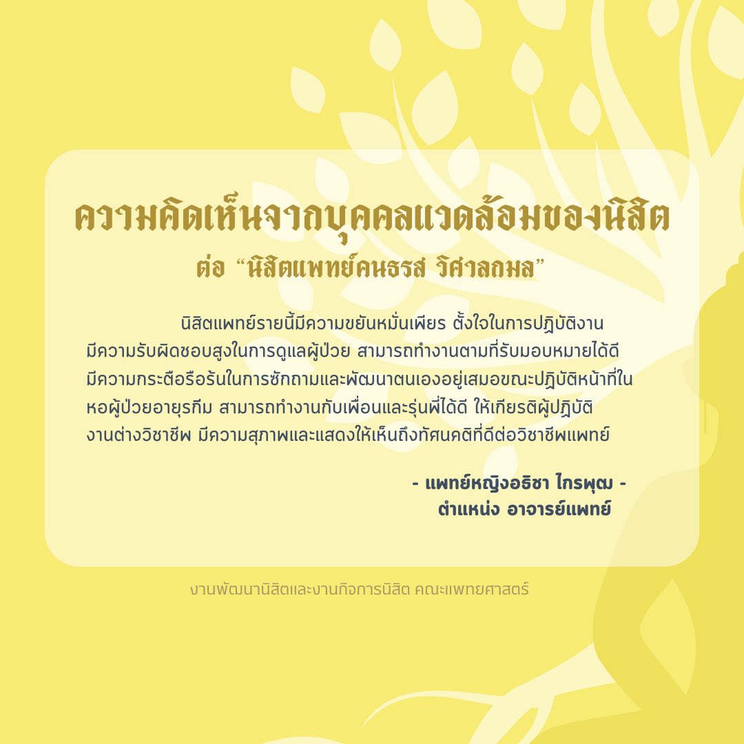 ขอแสดงความยินดีกับ “ นสพ.คนธรส วิศาลกมล ชั้นปีที่ 5 “ ที่ได้รับการคัดเลือกเป็นตัวแทนนิสิตคณะแพทยศาสตร์ มหาวิทยาลัยนเรศวร เพื่อรับรางวัลโล่เกียรติคุณนิสิตแพทย์ที่ประพฤติตนดีเด่น ในด้านคุณธรรม จริยธรรม จากแพทยสภา ประจำปี 2569 โดยงานกิจการนิสิตดำเนินการพิจารณาสัมภาษณ์และคัดเลือกโดยผ่านคณะกรรมการฯ เมื่อวันที่ 5 มีนาคม 2569